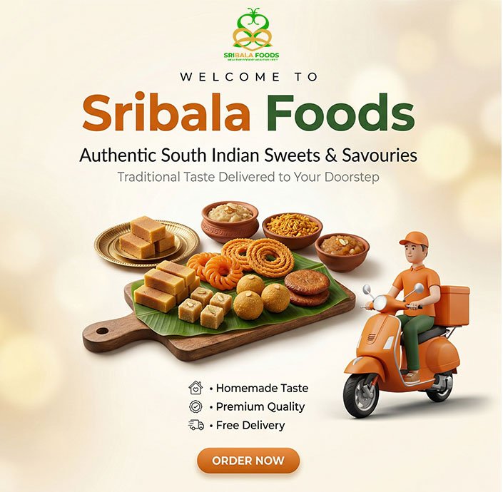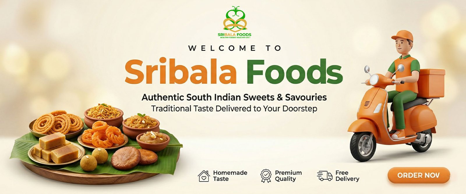 SriBala Foods is a traditional food brand that specializes in handmade sweets, savory snacks, and authentic homemade products. We focus on delivering rich taste, freshness, and quality using time-honored recipes and carefully selected ingredients.