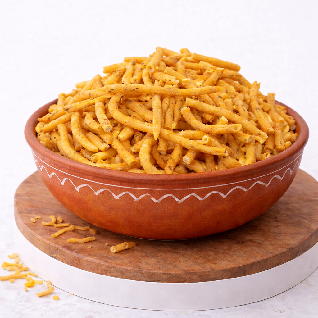 Sattur Sev (or Karasev) is a famous, crunchy, and spicy South Indian snack.